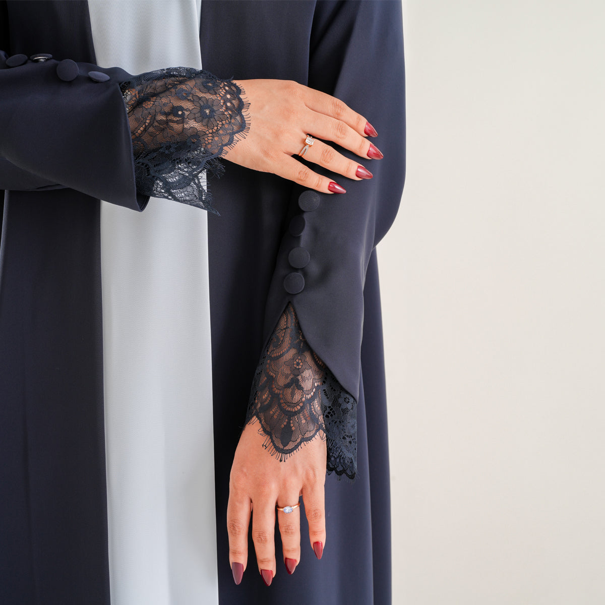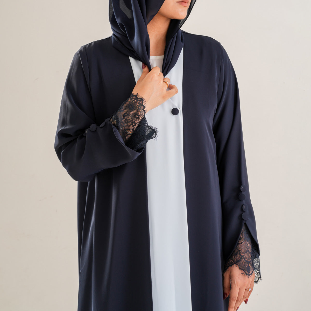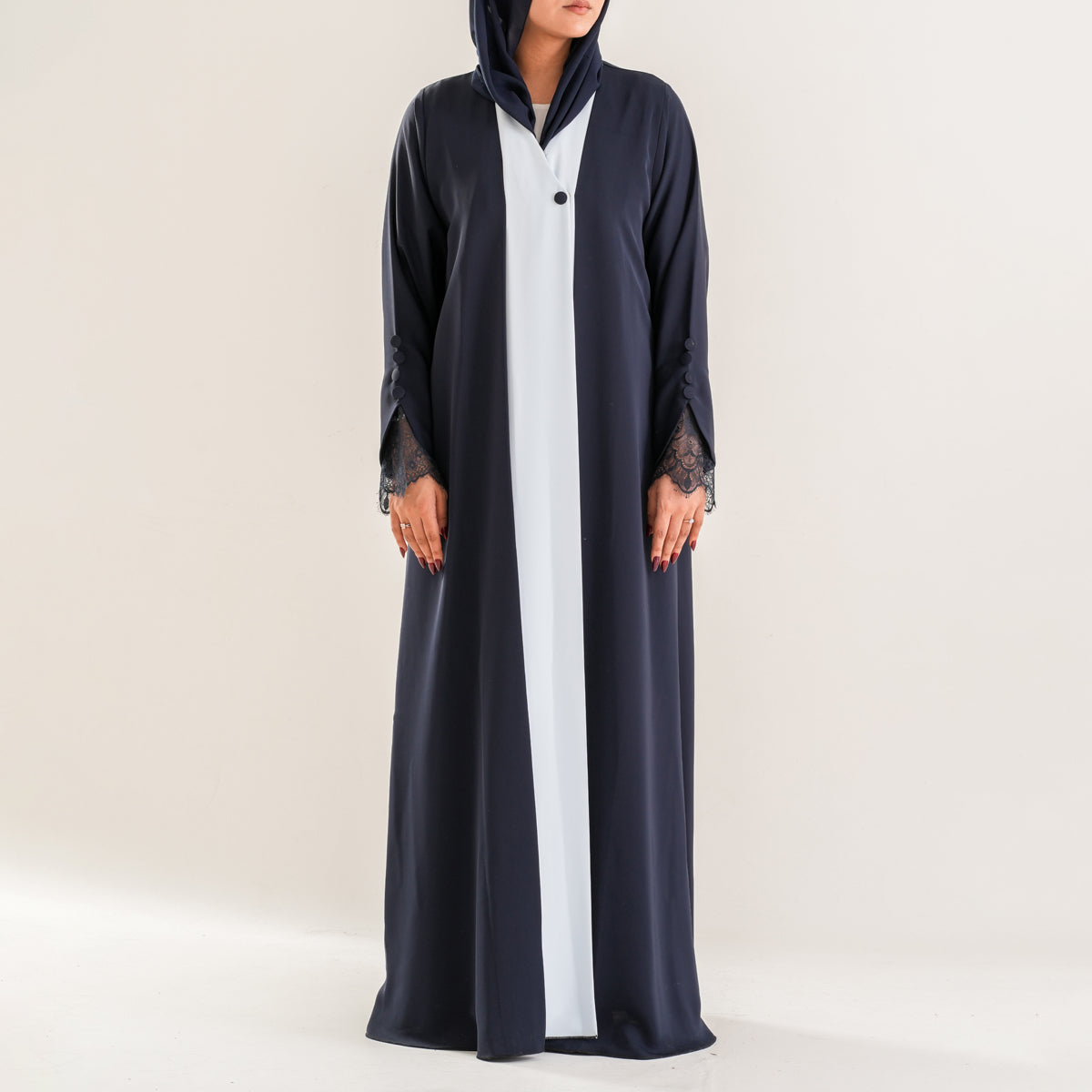 A lightweight, elegant, and flowy navy blue abaya featuring a soft powder blue front panel for a subtle contrast. Designed with V-cut sleeves, delicate lace detailing, and matching button accents - making it perfect for both everyday wear and special occasions.